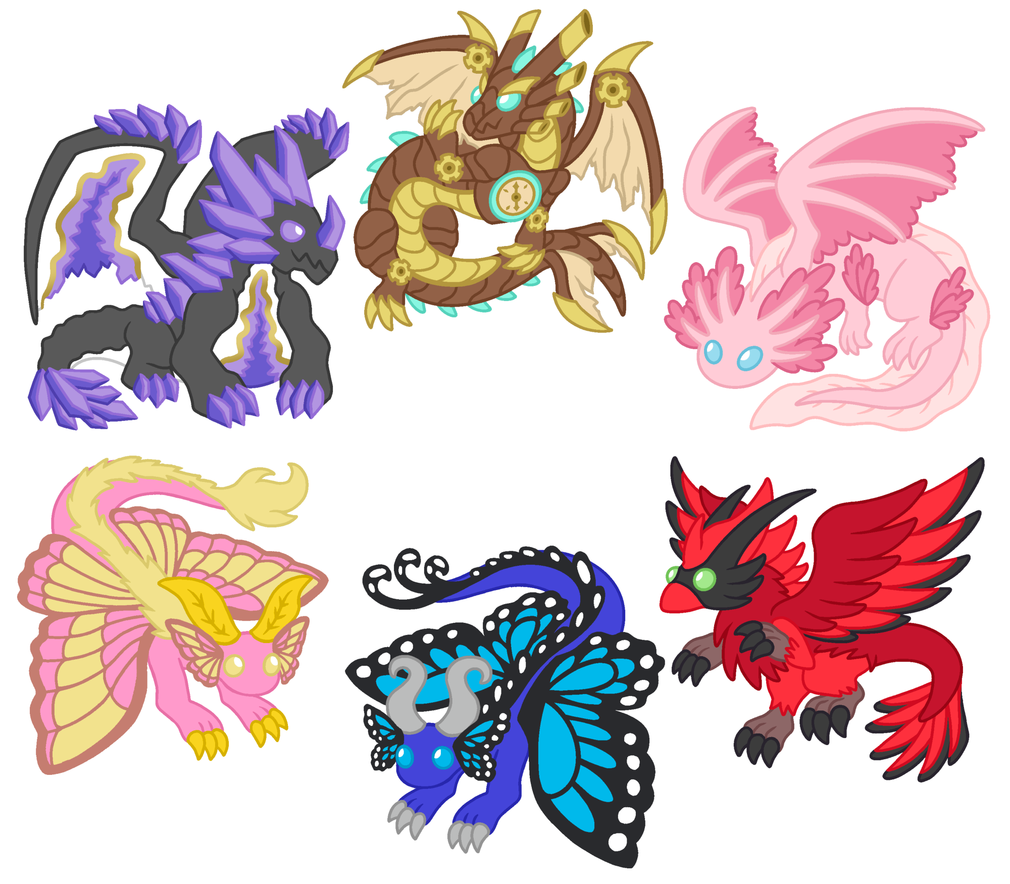 Original designs of cute dragons, now available as cute 3 inch vinyl stickers! All also feature Glitter accents! Axolotl Dwagon, Geode Dwagon, Steampunk Dwagon, Cardinal Dwagon, Rosy Maple Moth Dwagon, and Morpho Butterfly Dwagon!