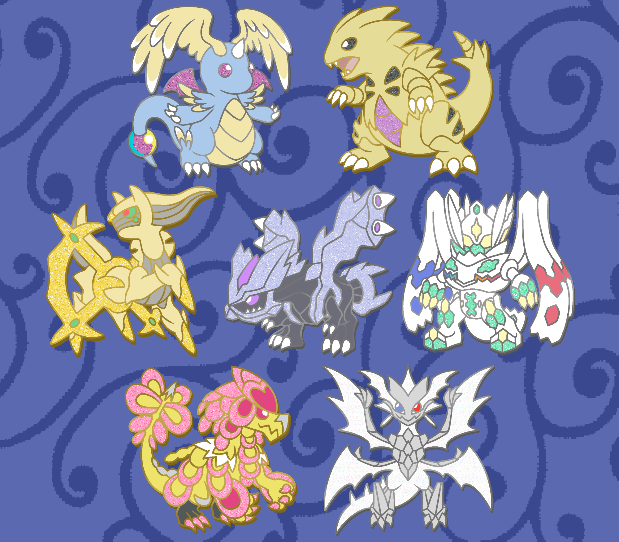 Your favorite shiny dragons from Powke Mons, shiny Mega Drampa, shiny Tyranitar, shiny Arceus, shiny Kyurem, shiny Zygarde, shiny Kommo-o, and shiny Ultra Necrozma, now available as cute 1.75 inch glitter enamel pins!