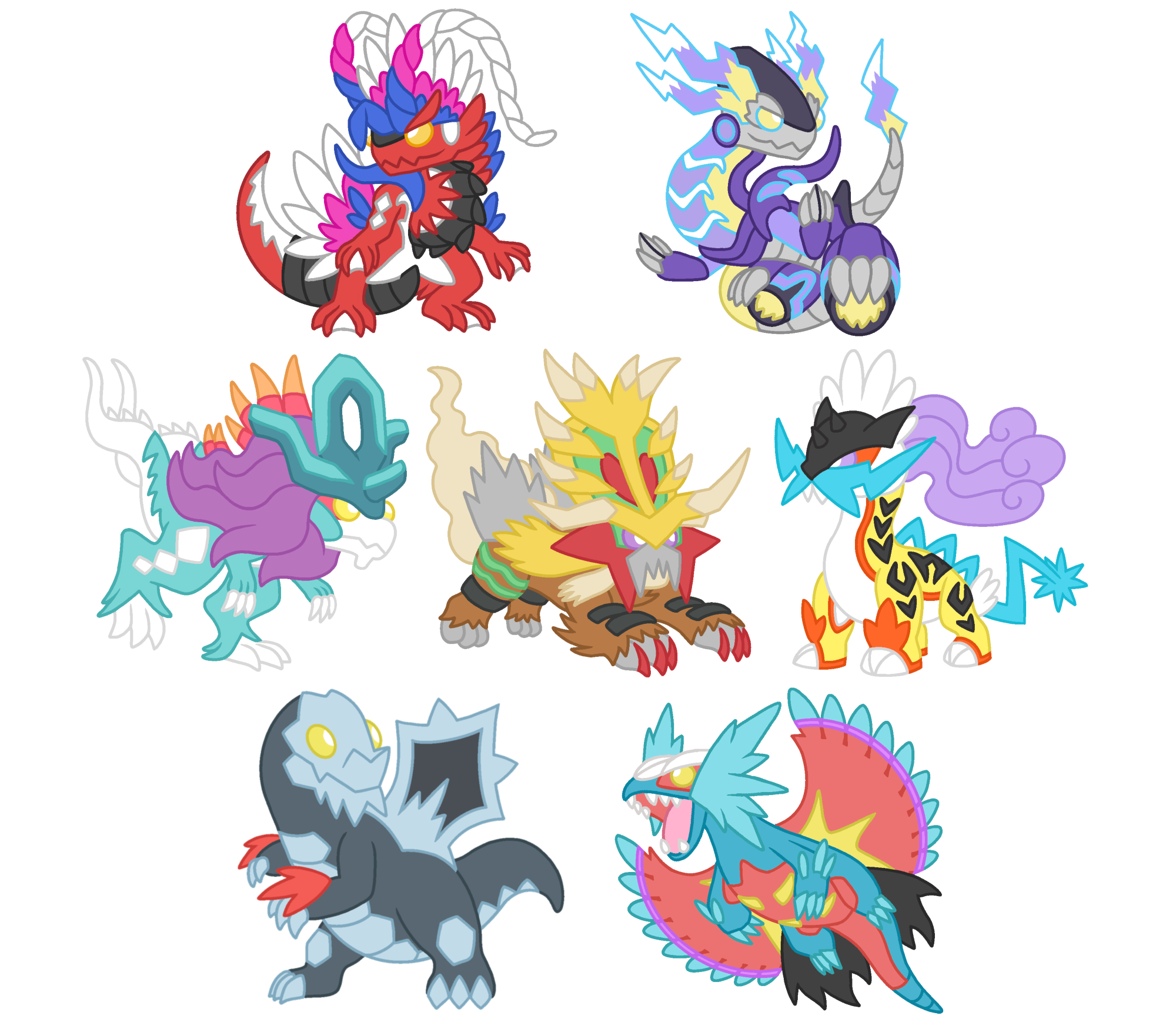 Your favorite new dragons from Powke Mons Scarlet and Violet, Koraidon, Miraidon, Baxcalibur, Walking Wake, Raging Bolt, Gouging Fire, and Roaring Moon, now available as cute 3 inch weatherproof vinyl stickers!